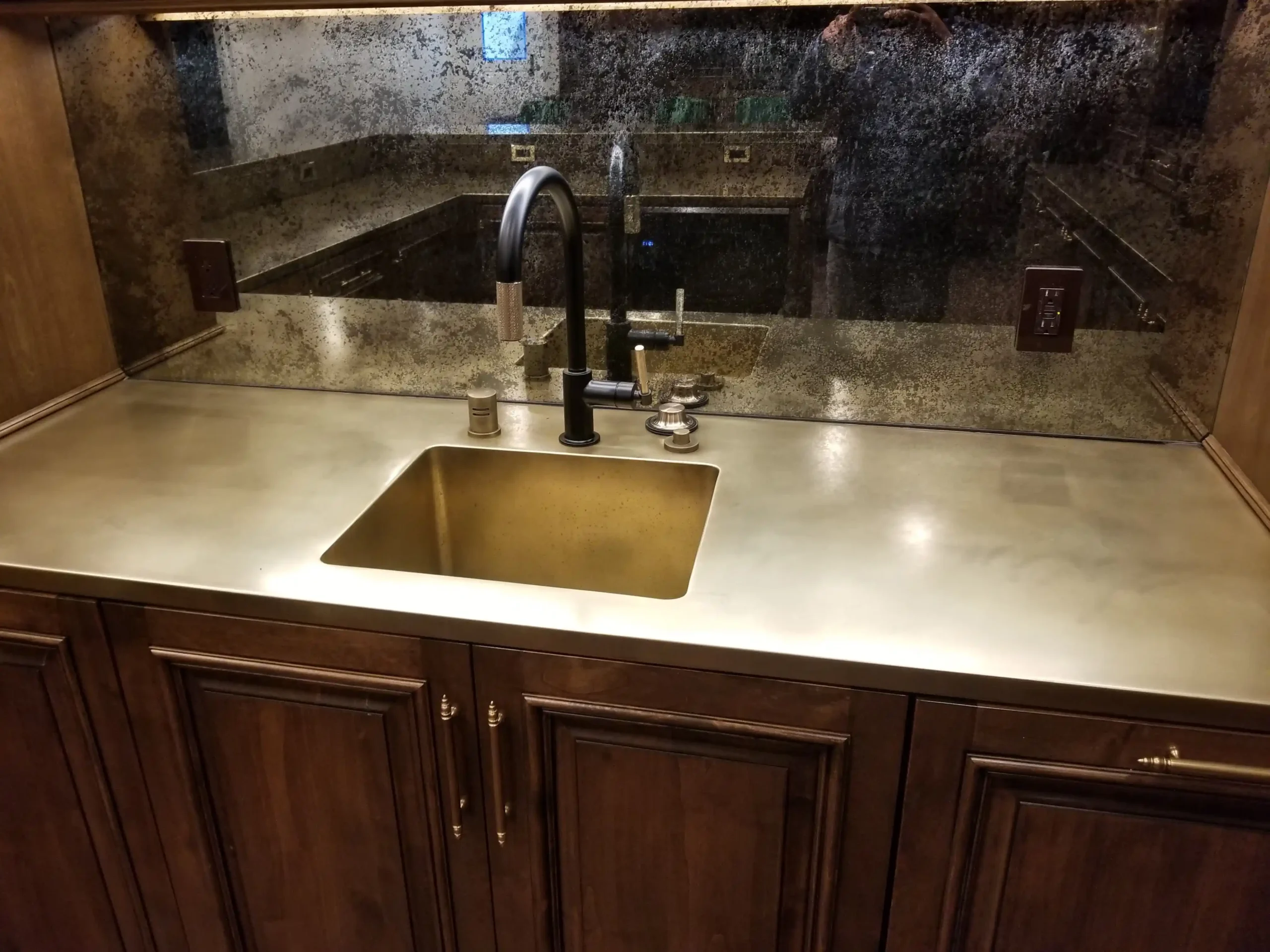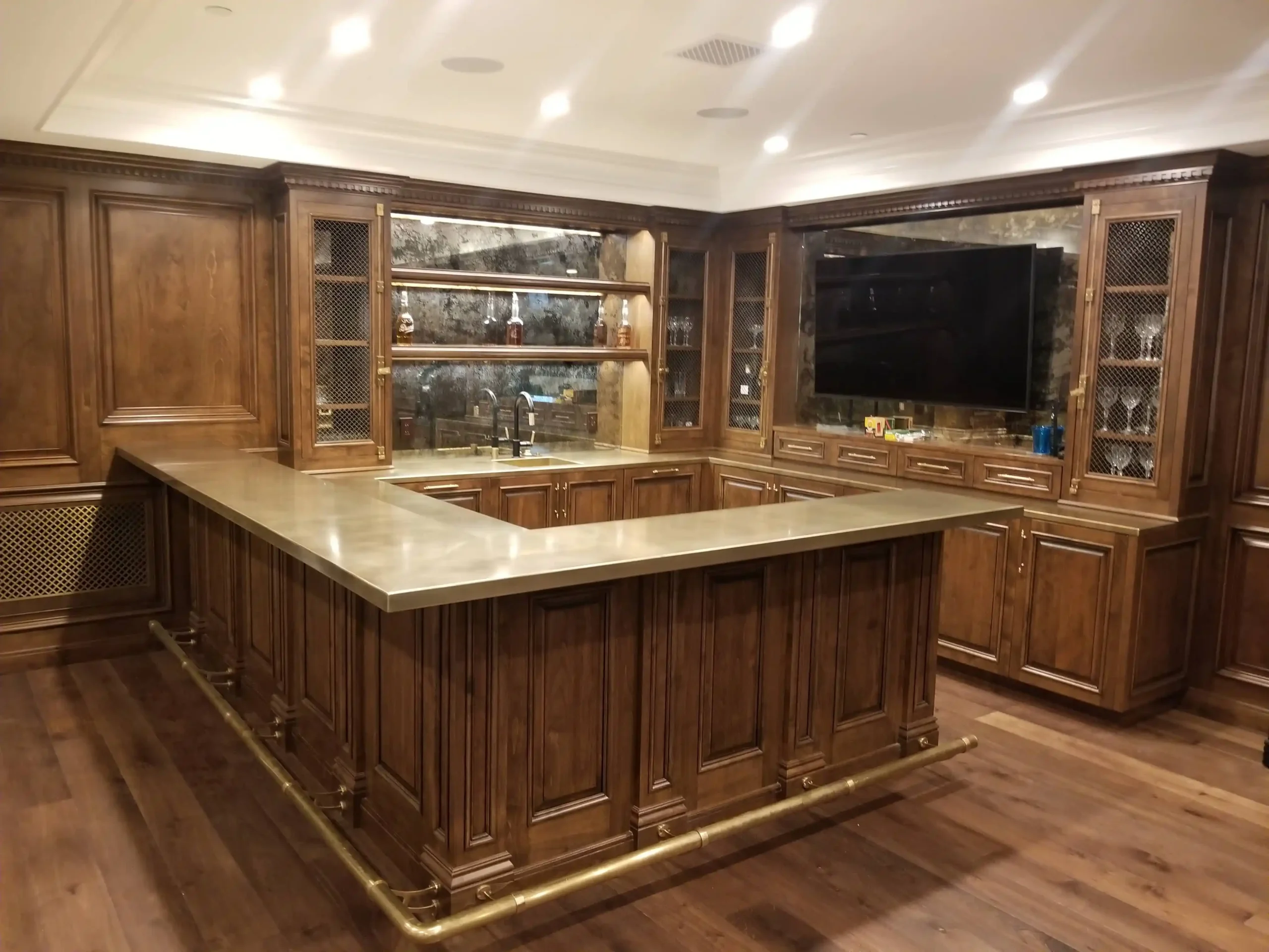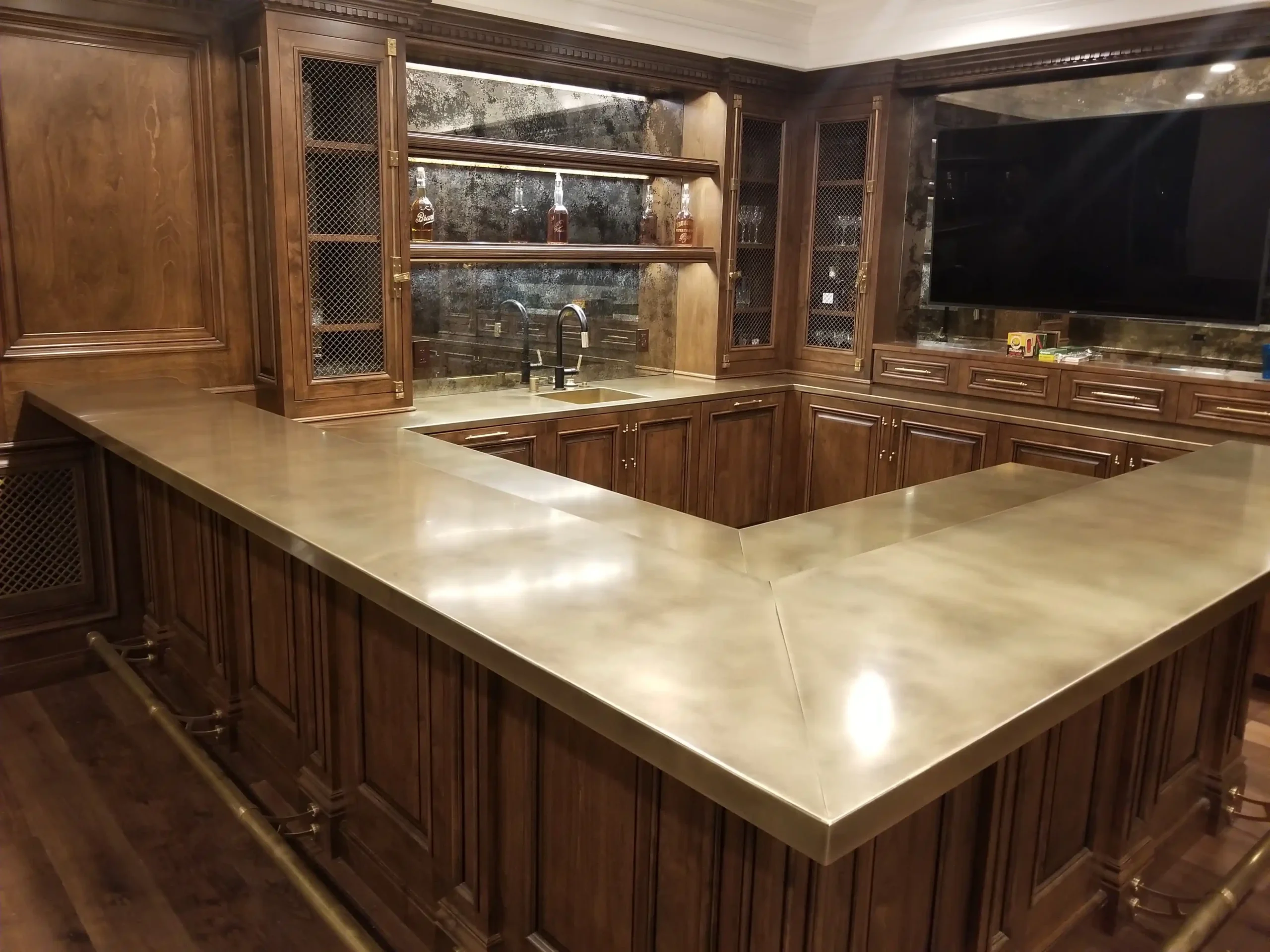 This exclusive Man Cave retreat features an impressive wet bar area expertly fabricated from brass sheet metal. The bar is designed with bronze counter tops on all four sides, providing a luxurious and cohesive look. A functional brass sink is seamlessly welded into the bronze countertop, enhancing usability. The space is complemented by unique antique mirrors in the backsplash, adding character and depth, making it an ideal setting for entertaining and relaxation in a sophisticated retreat.