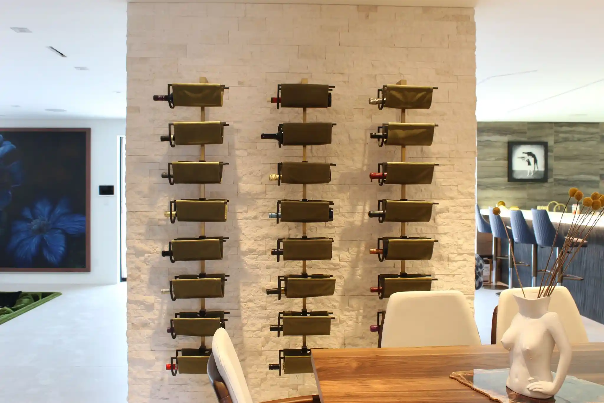 Introducing the Wine Hammock, a unique wine rack that features a striking design combining bronze metal with a hammock-like cradle made from luxurious leather calf skin. This innovative structure allows wine bottles to sway gently, providing a unique twist to wine storage while enhancing aeration. The wine hammock is supported by an elegant single support spine, available in various finishes, including blackened steel, satin brass and stainless steel. This sophisticated piece not only serves as a functional wine storage solution but also adds a touch of moder elegance to any space, making it an eye-catching focal point for wine enthusiasts.