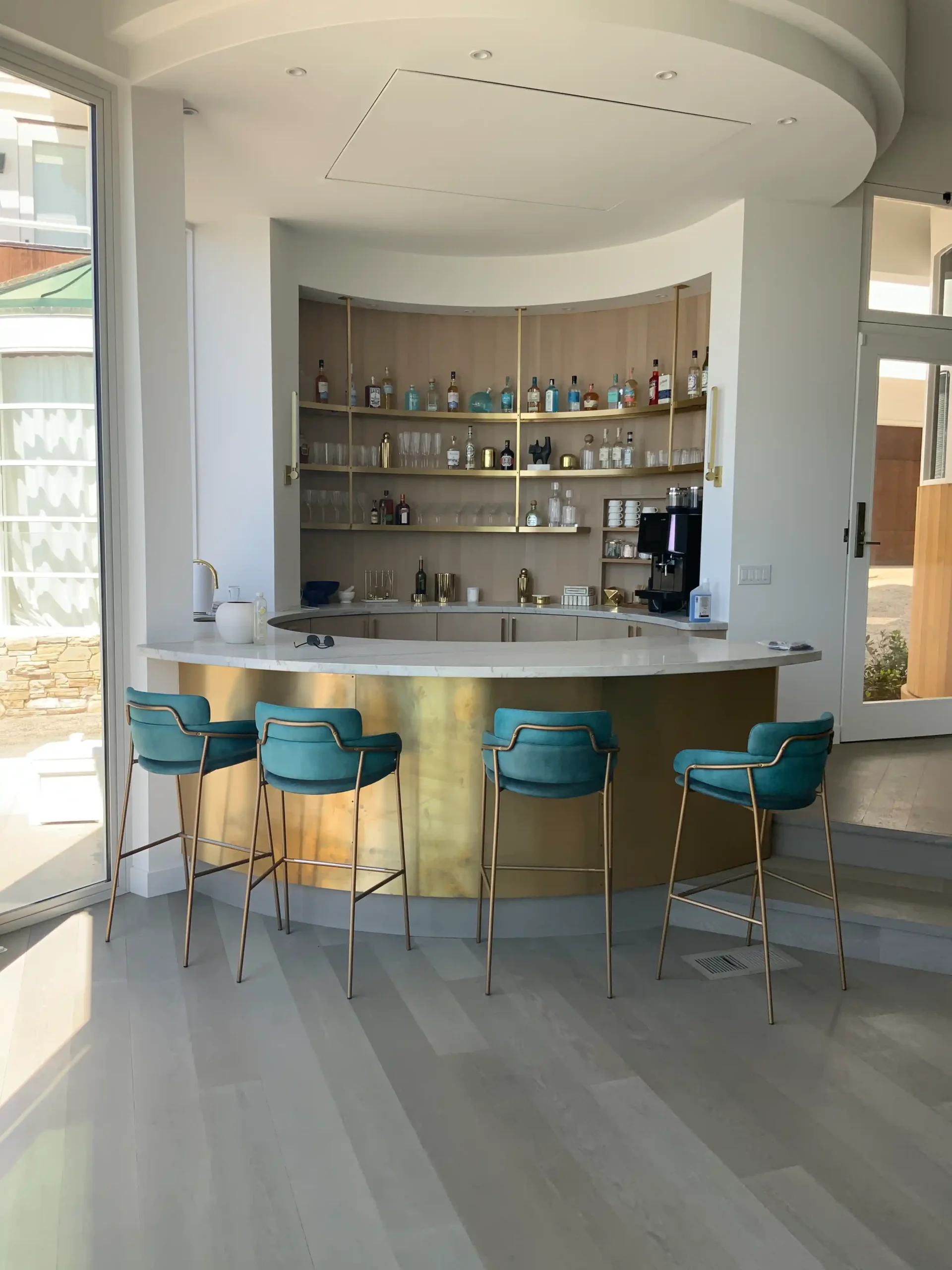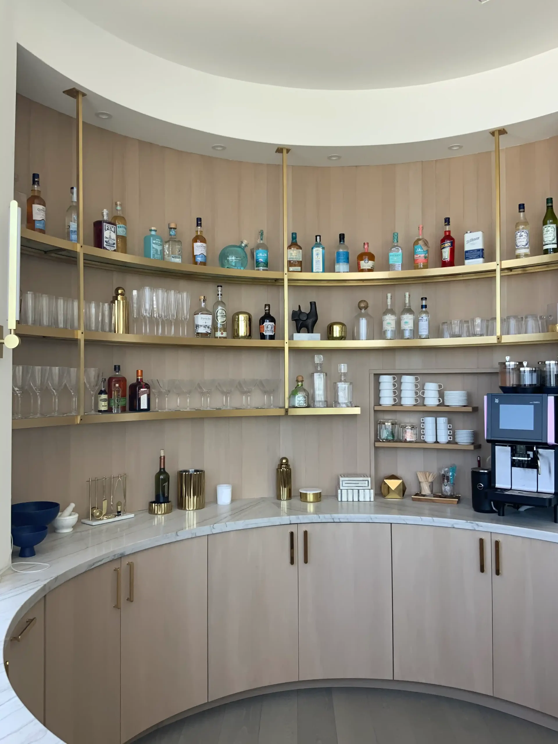 The modern bar features beautifully crafted bronze metal elements paired with elegant marble countertops. The architectural bronze, finished with a satin sheen, is expertly integrated into the design, enhancing the overall aesthetic. Built around radius walls, the bar creates a smooth and flowing space. Ceiling-mounted brass and glass shelving showcase an impressive selection of bottles and glasses, adding a refined touch. The adjoining sitting area is adorned with radius bronze wall coverings, contributing to the bar’s upscale ambiance. This combination of high-quality materials and thoughtful design elements results in a sophisticated and elegant environment.