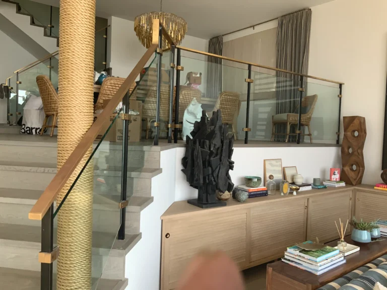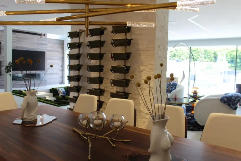 This modern bar features a striking design, vertically hung from the ceiling, providing a unique and open aesthetic. It incorporates low iron glass shelving, offering a contemporary solution for displaying