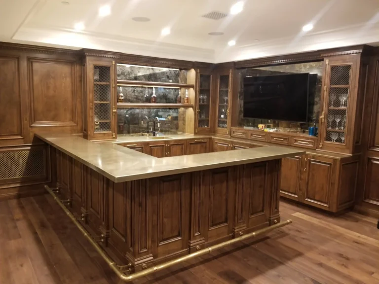 This exclusive Man Cave retreat features an impressive wet bar area expertly fabricated from brass sheet metal. The bar is designed with bronze counter tops on all four sides, providing