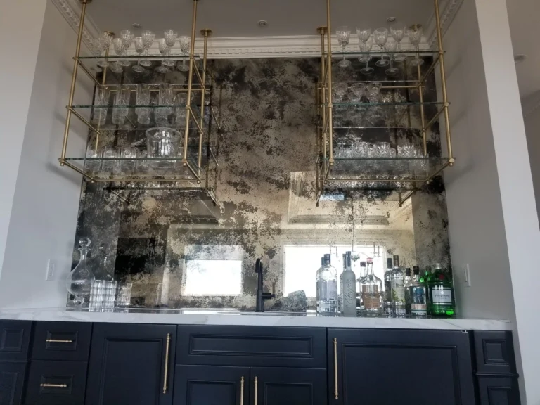 This ceiling mounted shelving unit combines bronze and wood to create a stunning display for wine glasses, champagne flutes, and other glassware. Floating elegantly above the magnificent counter, this shelving