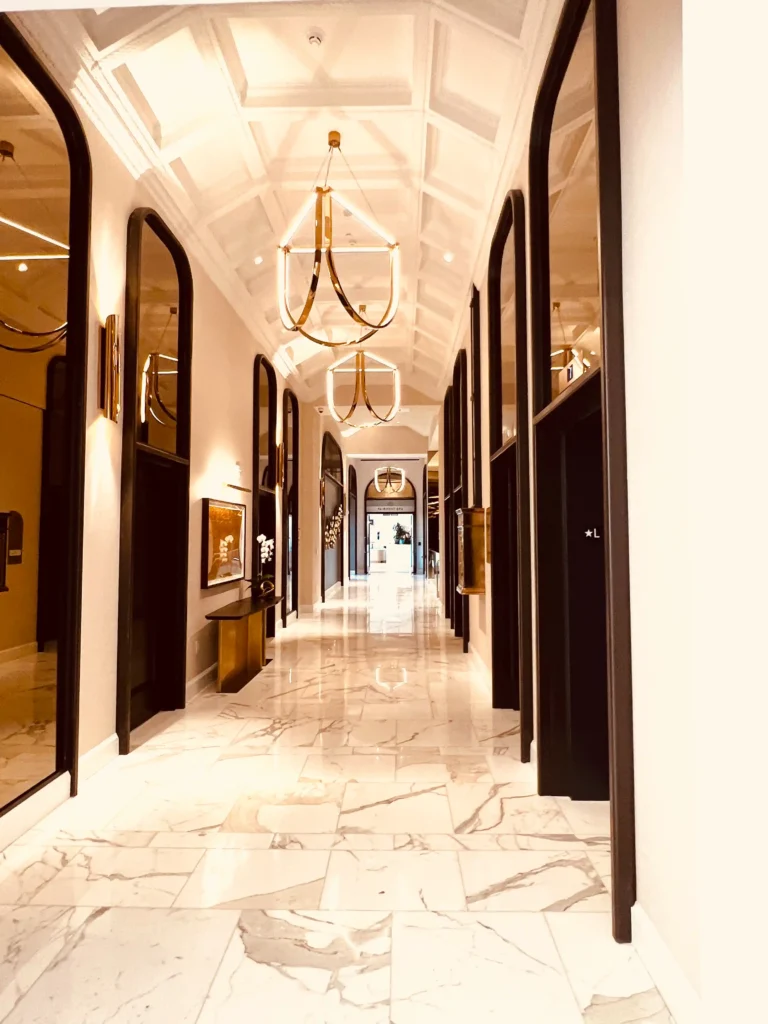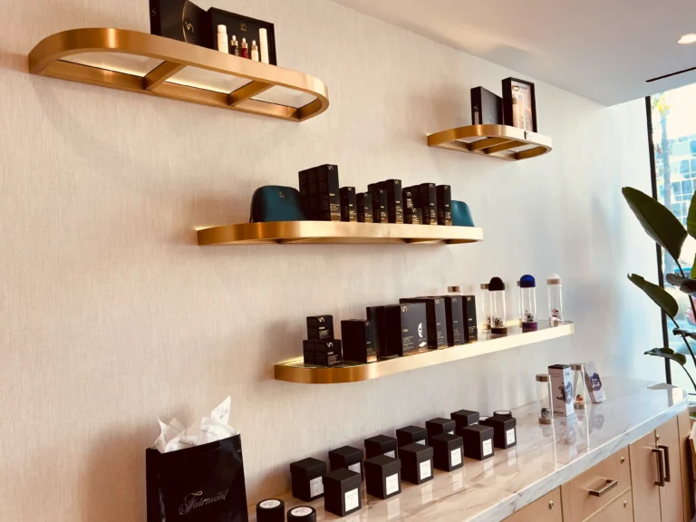The hotel spa area showcases a contemporary design with floating display shelves that enhance the sense of space and organization. It features bronze framing with rounded corners, providing a smooth
