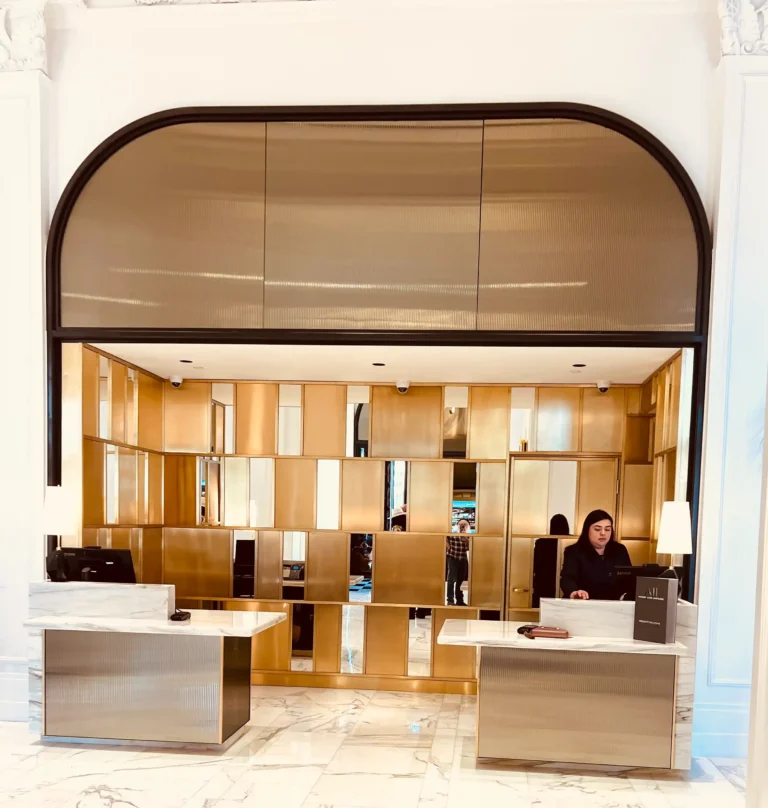 The reception area of this historical hotel features a distinctive architectural design with steel arches finished in ribbed bronze antique mirrors, which add a touch of elegance and depth to