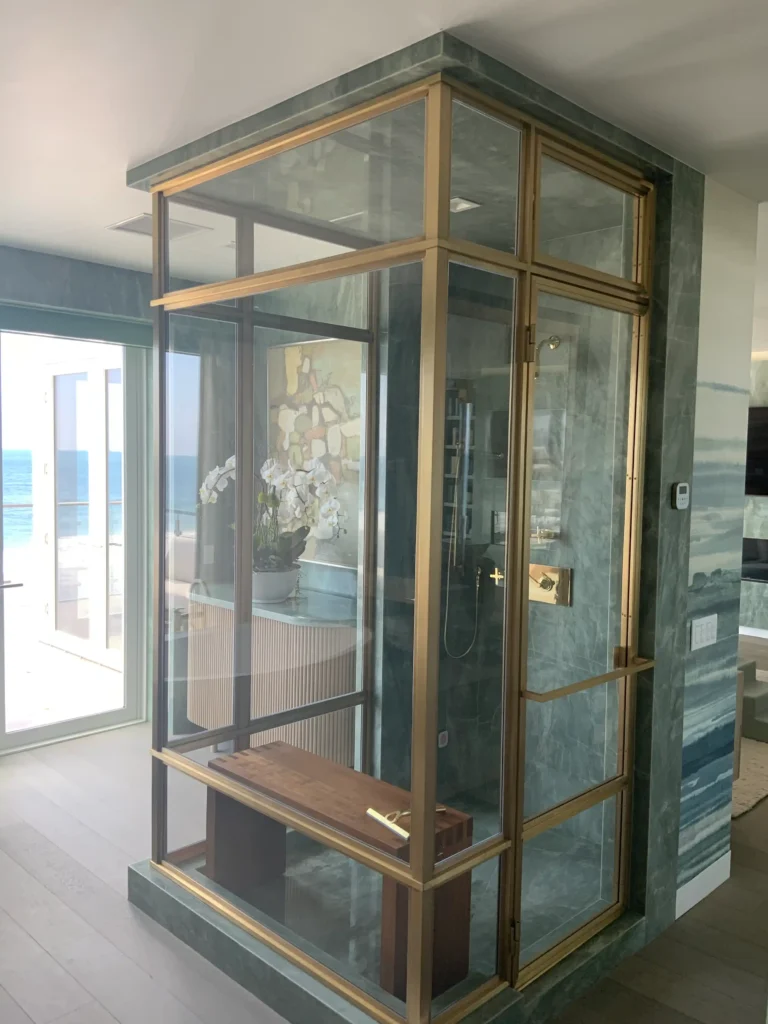 This one-of-kind shower enclosure is meticulously crafted from architectural bronze with a satin finish, offering a luxurious and durable design. It features low iron tempered glass, providing clarity and strength