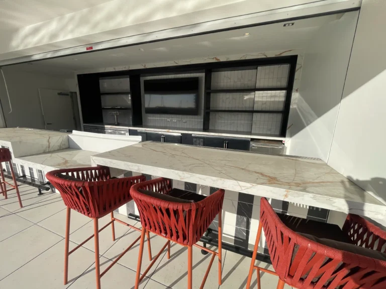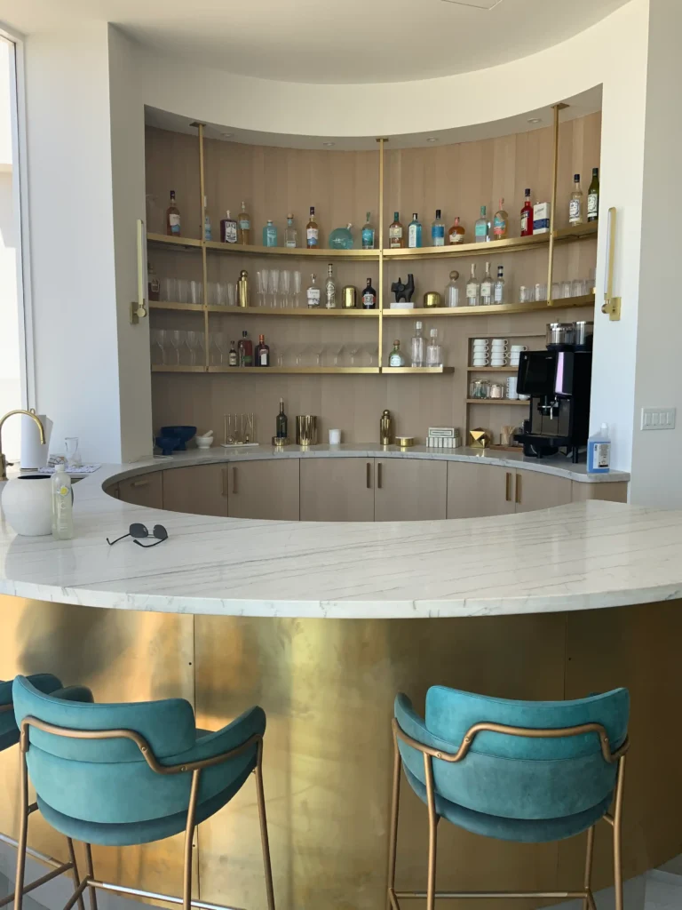 The modern bar features beautifully crafted bronze metal elements paired with elegant marble countertops. The architectural bronze, finished with a satin sheen, is expertly integrated into the design, enhancing the
